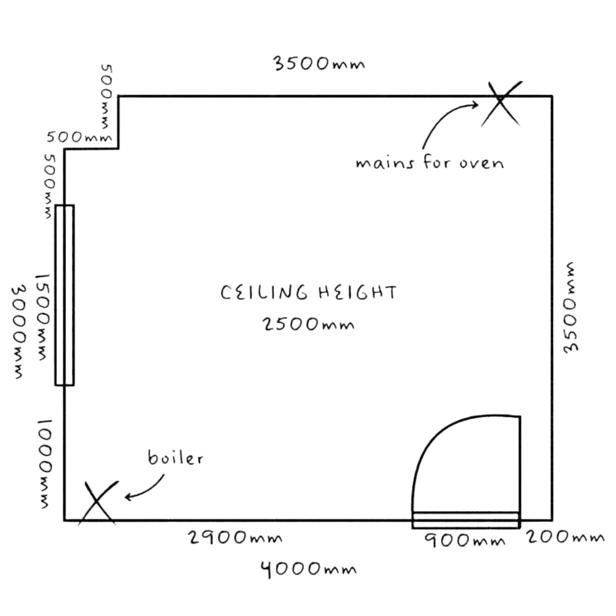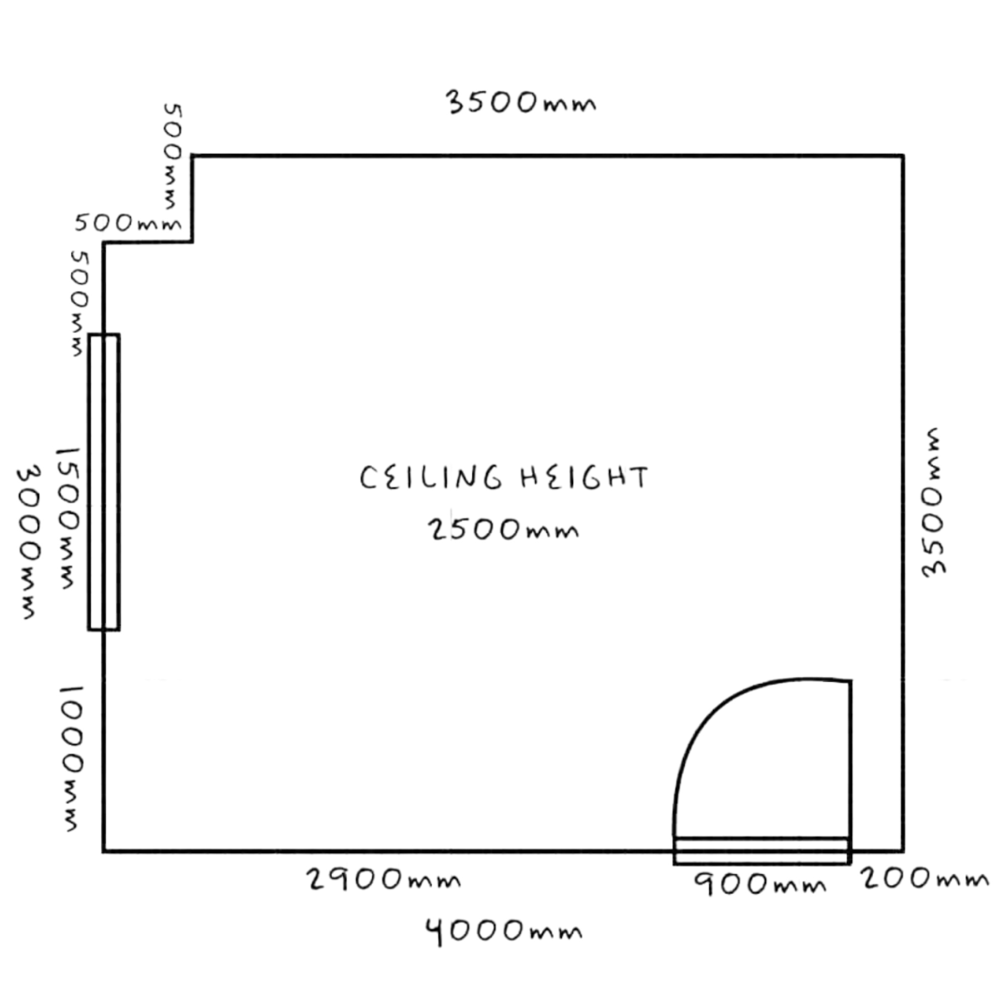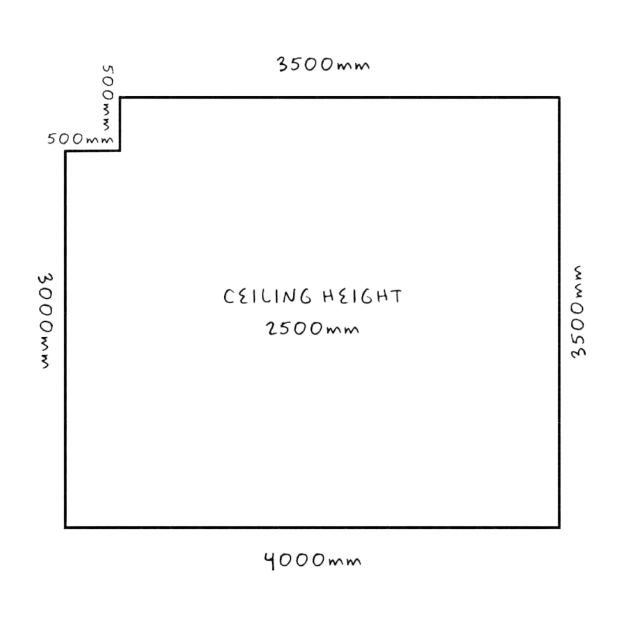 Start by sketching the shape of the room and noting the length of each wall in millimetres as you go. Be sure to include the ceiling height as well.